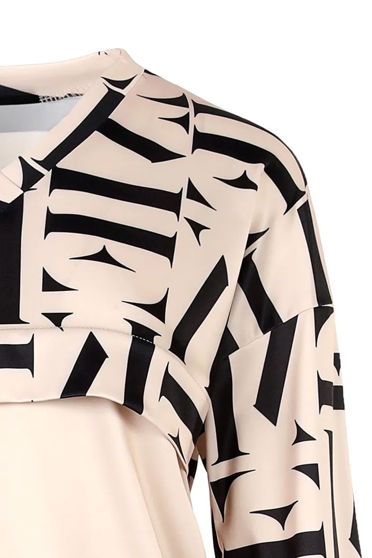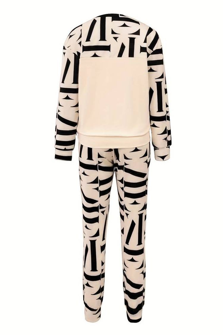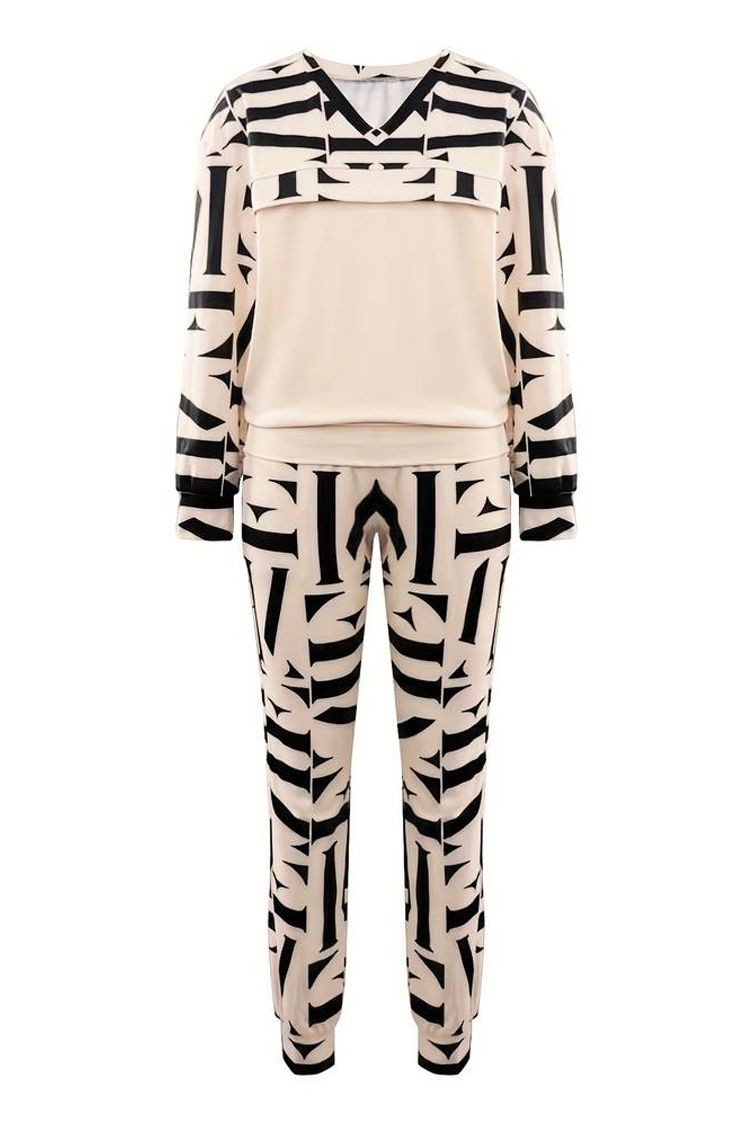 - Bluza ima duge rukave s gumicom na kraju i trokutasti izrez, a hlače su visokog struka i udobnog kroja.