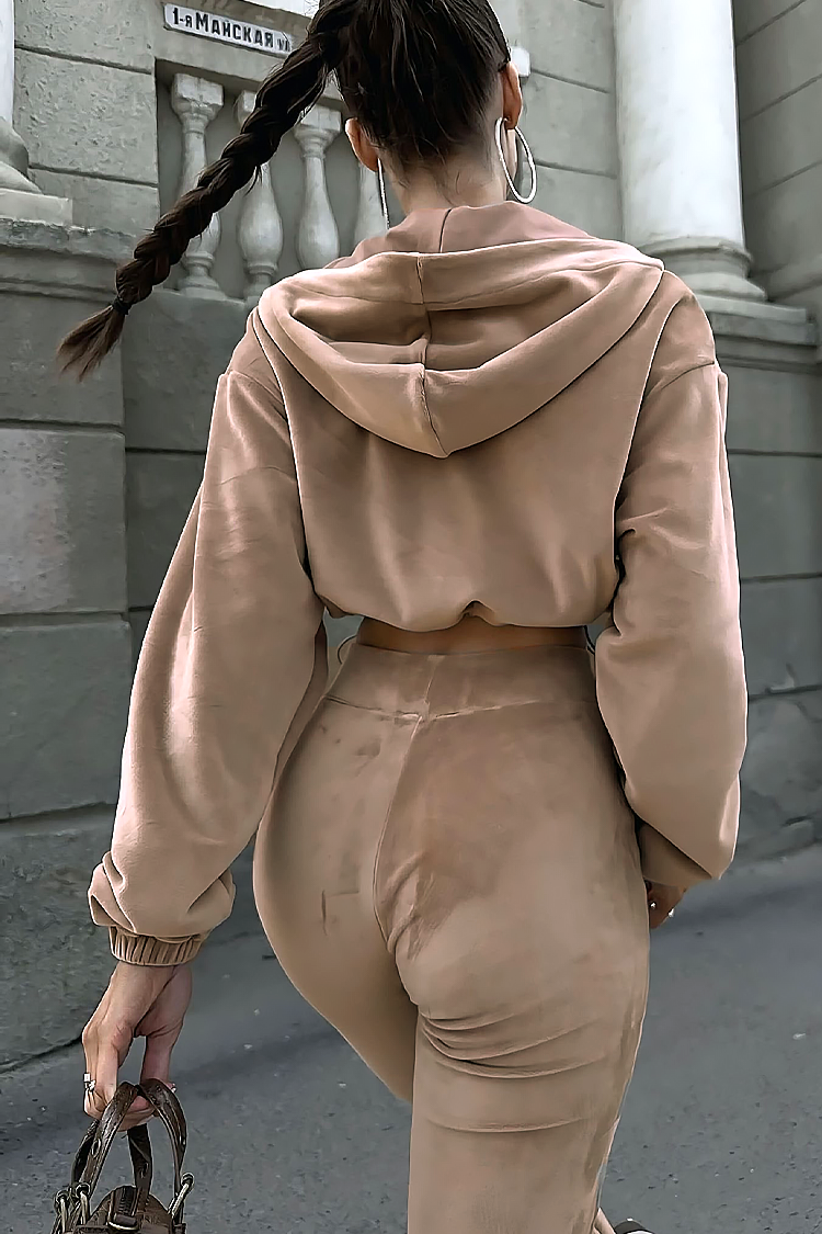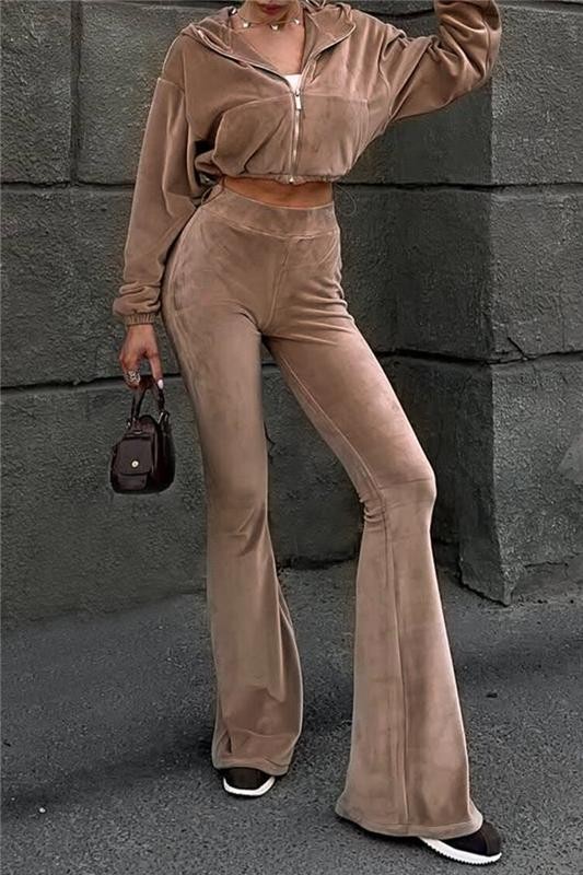 - Dukserica s kapuljačom ima skraćenu duljinu i kapuljaču, a hlače imaju pripijeni kroj i visoki struk.