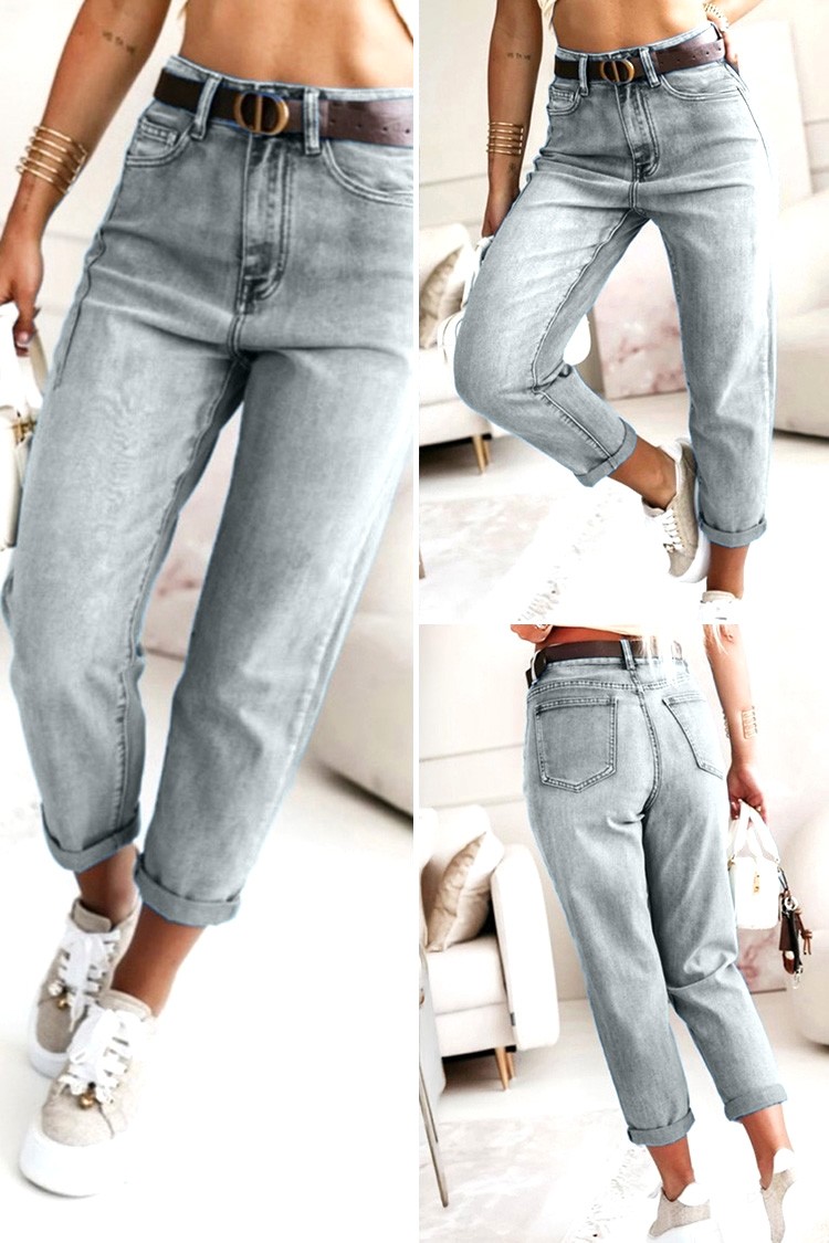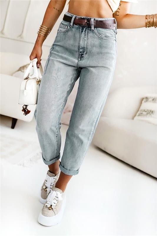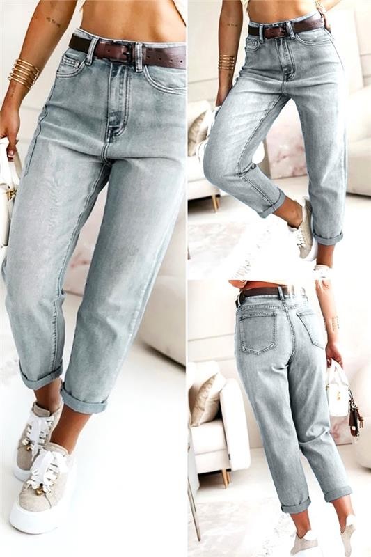 - Model ima visoki struk, široki kroj, rub i dolazi sa smeđim remenom s metalnom kopčom.
