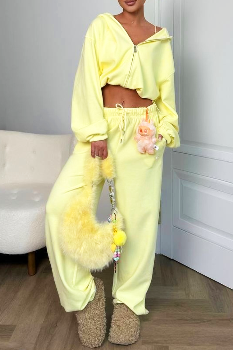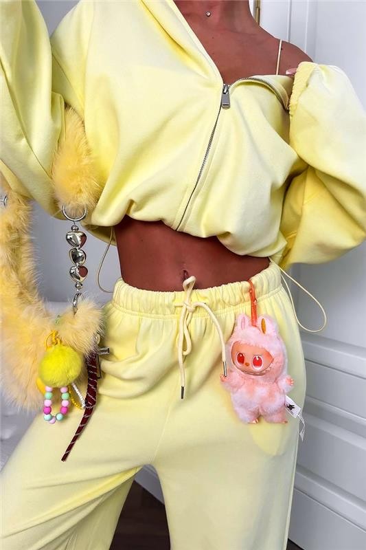 - Kratka majica s kapuljačom, kombinirana s hlačama s visokim elastičnim strukom i izrezom za moderan izgled.