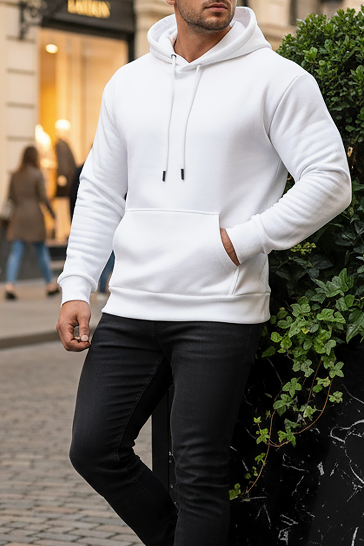 - Praktična muška dukserica s kapuljačom klasične bijele boje, prikladna za svakodnevni život.