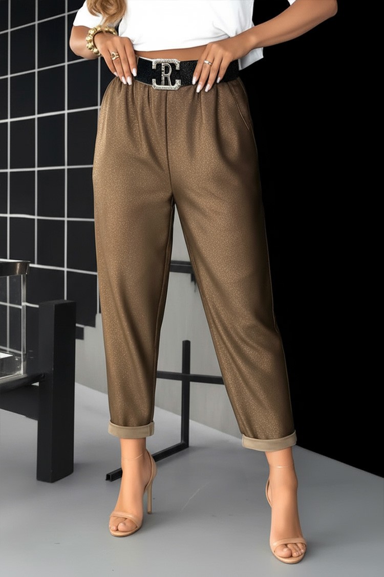 - Ženske hlače visokog struka i proširenog kroja, prikladne za moderan svakodnevni izgled.