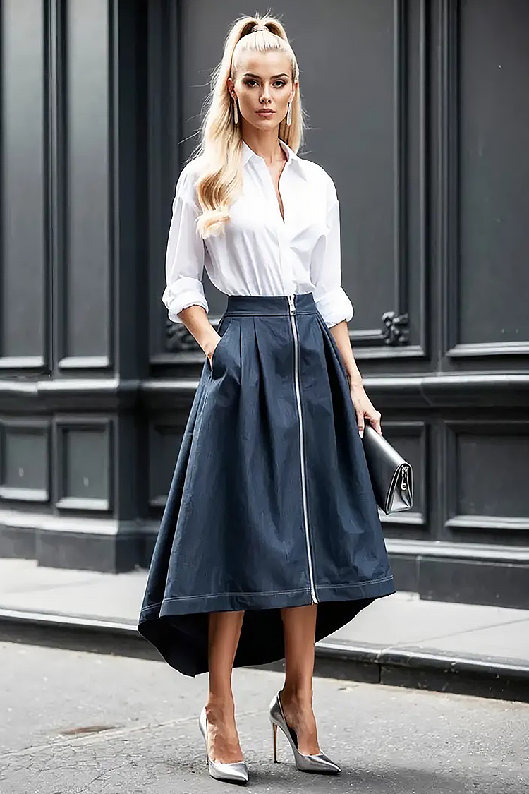 - Suknja ima asimetričnu duljinu, visoki elastični struk i patentni zatvarač sprijeda.