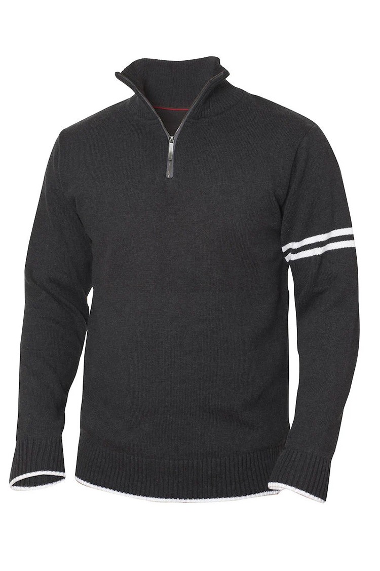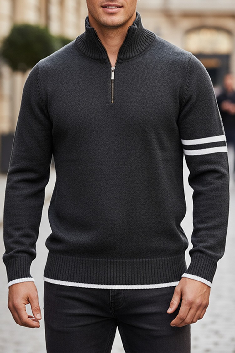 - Moderni muški džemper s polo ovratnikom i patentnim zatvaračem, prikladan kao dodatak svakodnevnoj odjevnoj kombinaciji.