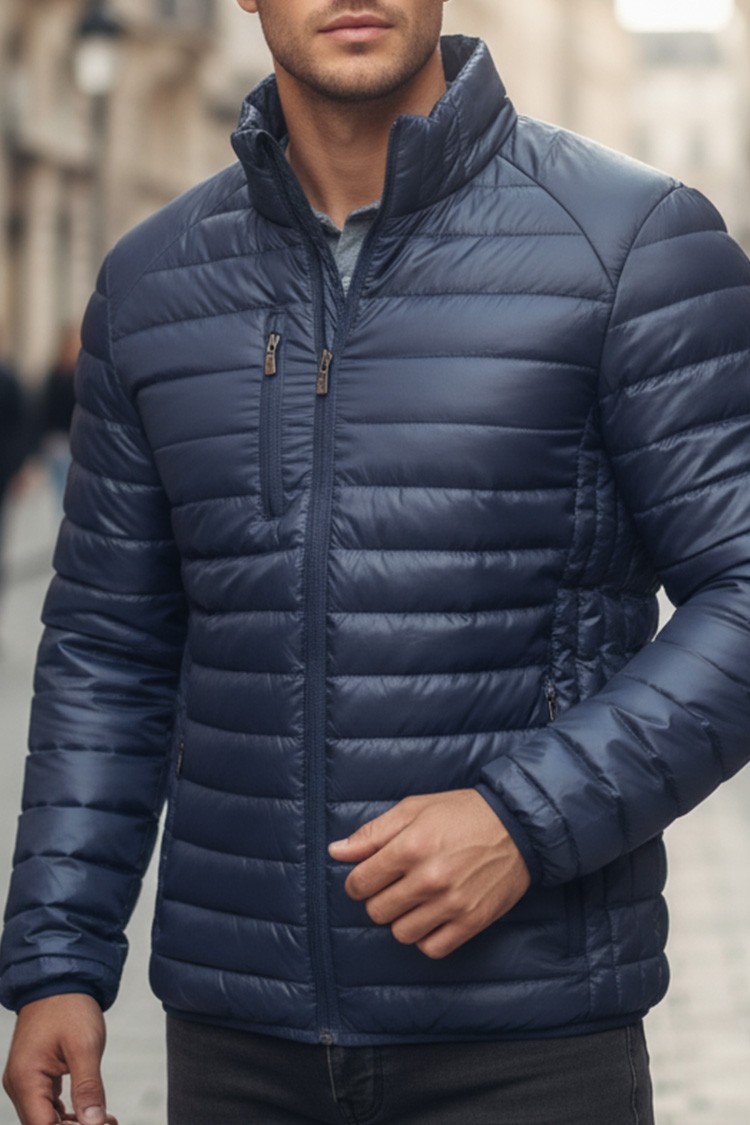 - Udobna muška jakna u tamnoplavoj boji, središnji patentni zatvarač i džepovi.