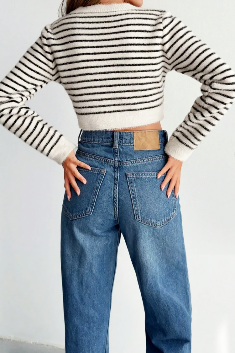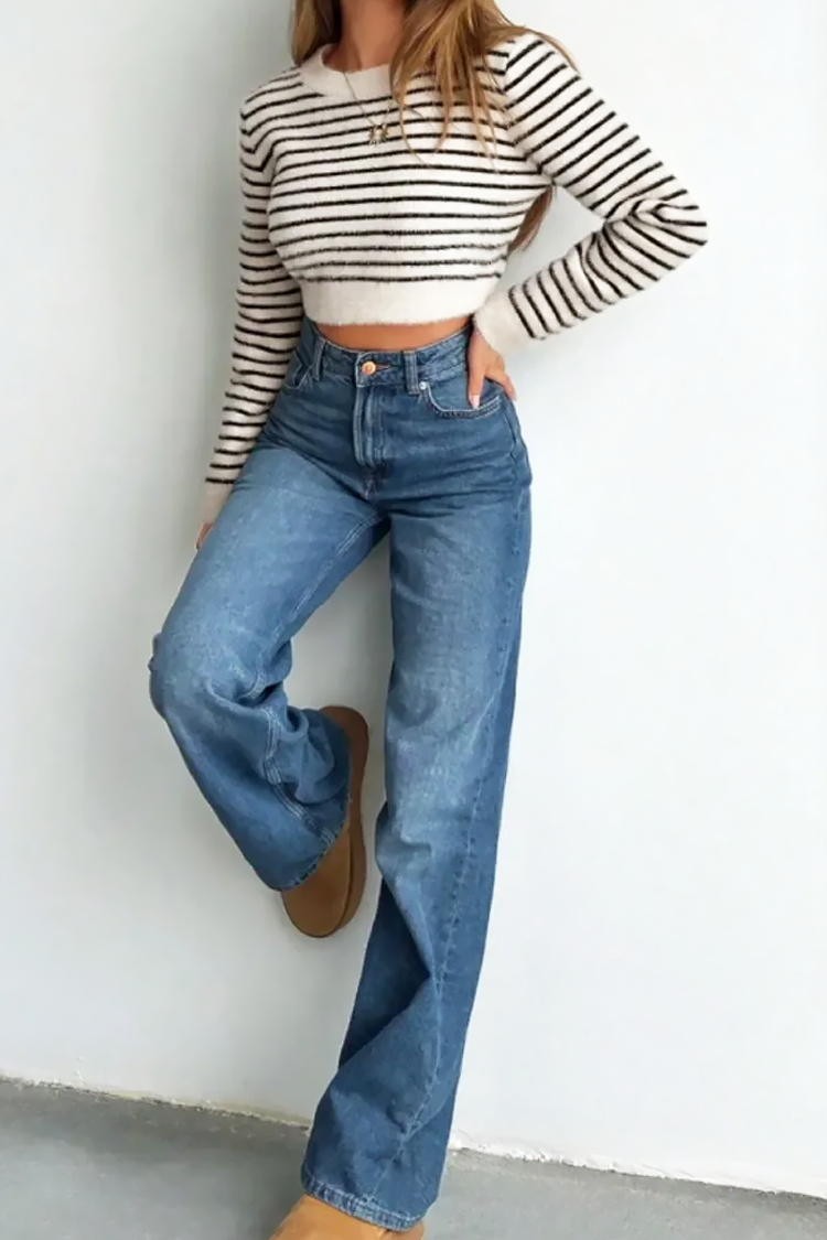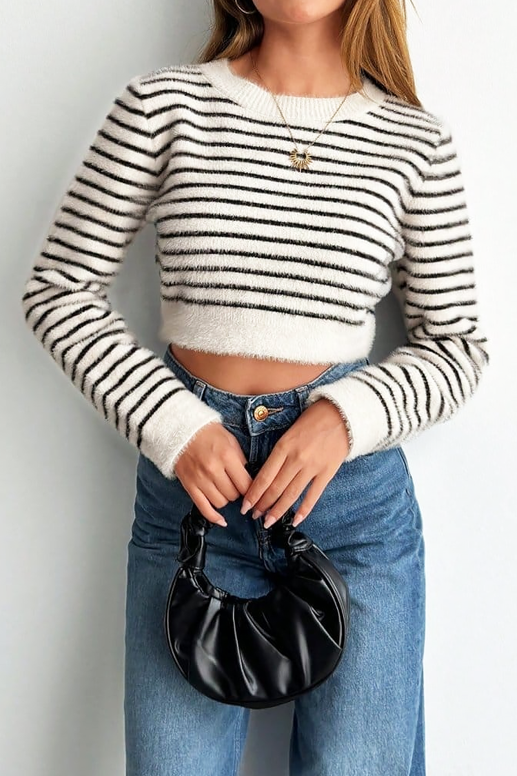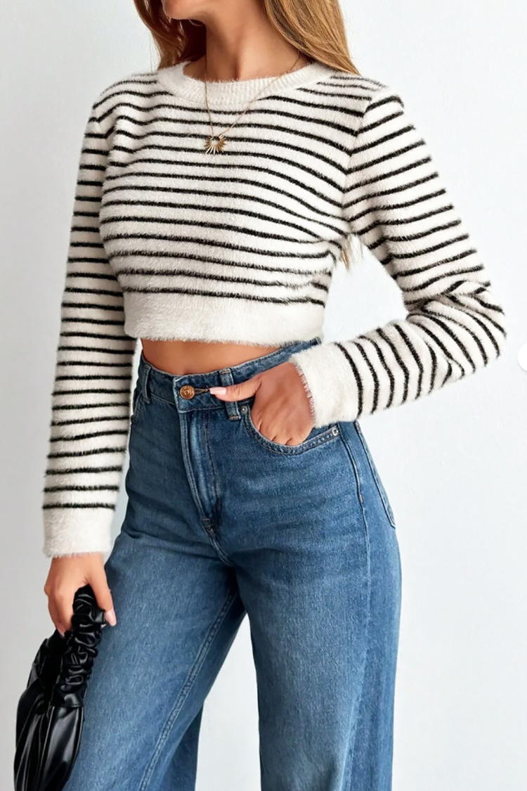 - Model ima duge rukave, pripijeni kroj, crop duljinu i prugasti uzorak.
