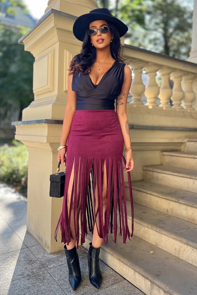 - Moderna midi suknja sa seksi dizajnom izrađena od eko brušene kože, prikladna za svakodnevne trendi izglede.