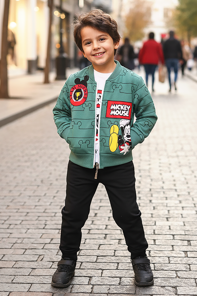 - Dječji dvodijelni set s printom Mickeyja Mousea, koji se sastoji od majice s kapuljačom i hlača.