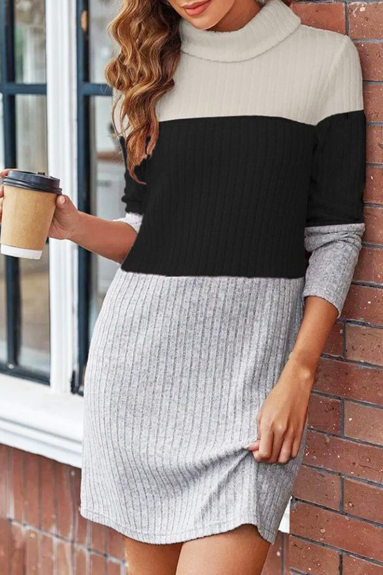 - Haljina ima duge rukave, udoban kroj i višebojni uzorak.