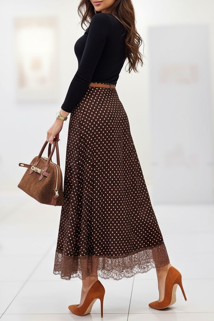 - Model ima precizan kroj, visoki struk, točkasti uzorak i čipku.