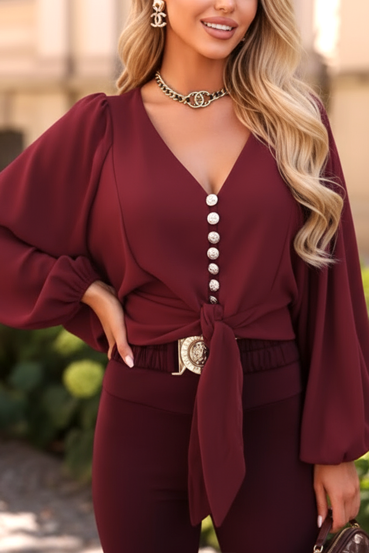 - Savršeno pristaje figuri. Model ima duge rukave i spektakularan dekolte, gumbe sprijeda i trendi boju.