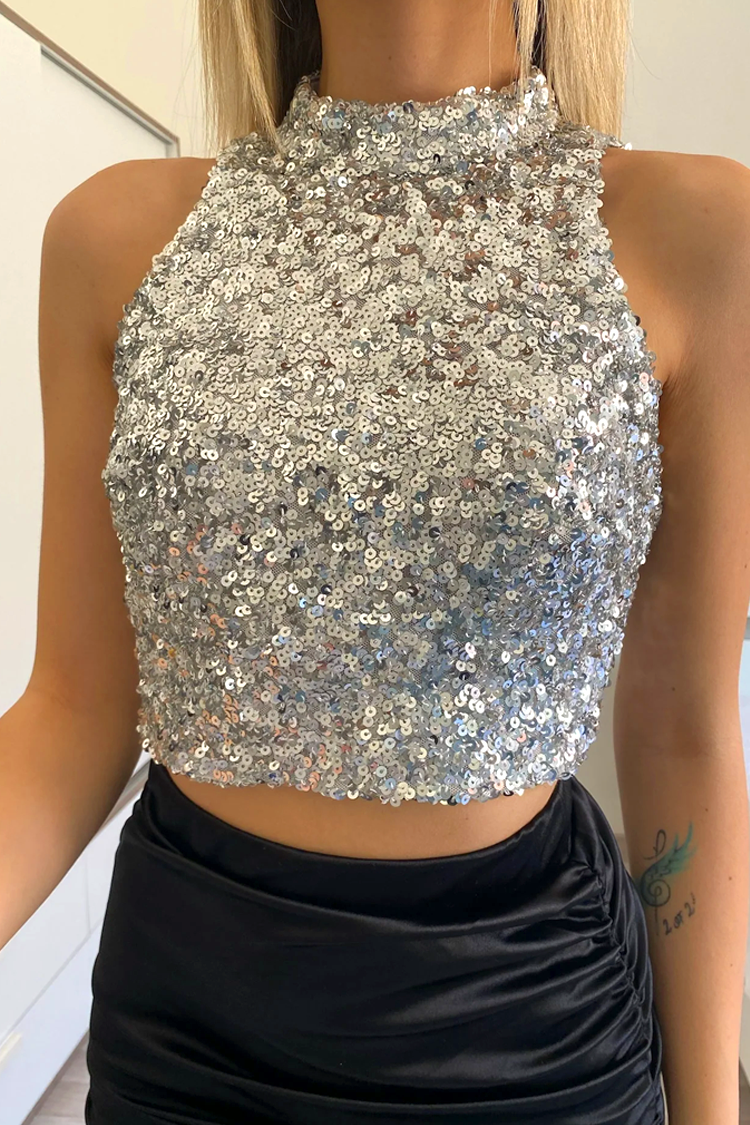 - Top ima spektakularna gola leđa i sjajne šljokice u sivoj paleti.