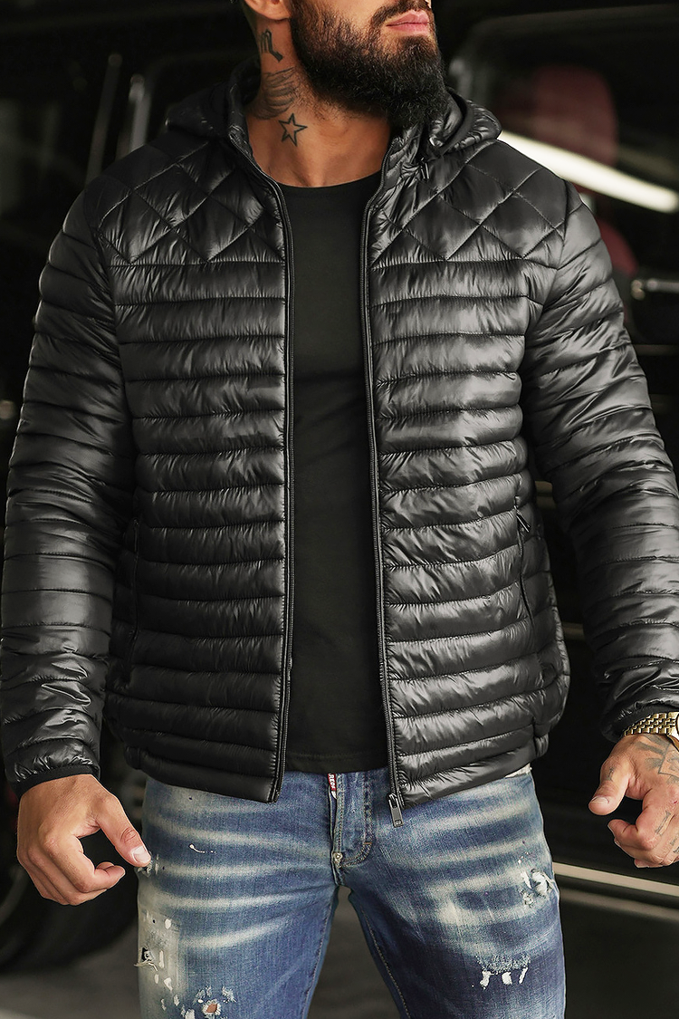 - Udobna muška jakna s prošivenim dizajnom u crnoj boji i kapuljačom sportsko-svakodnevnog stila.
