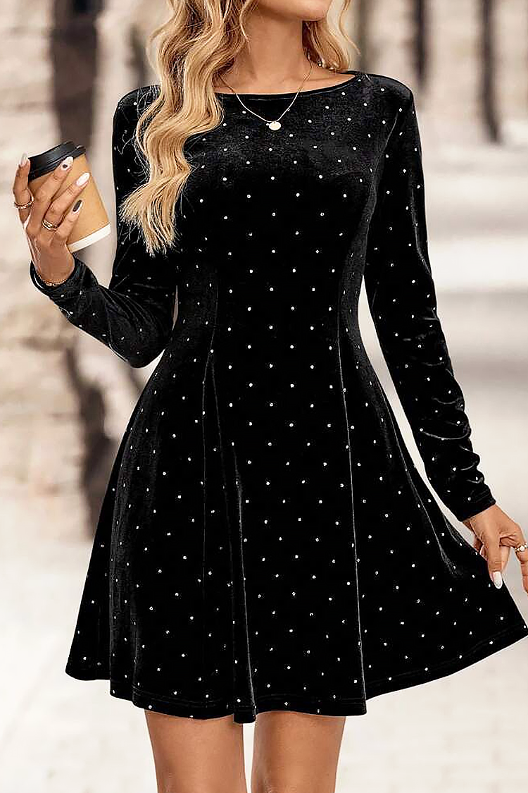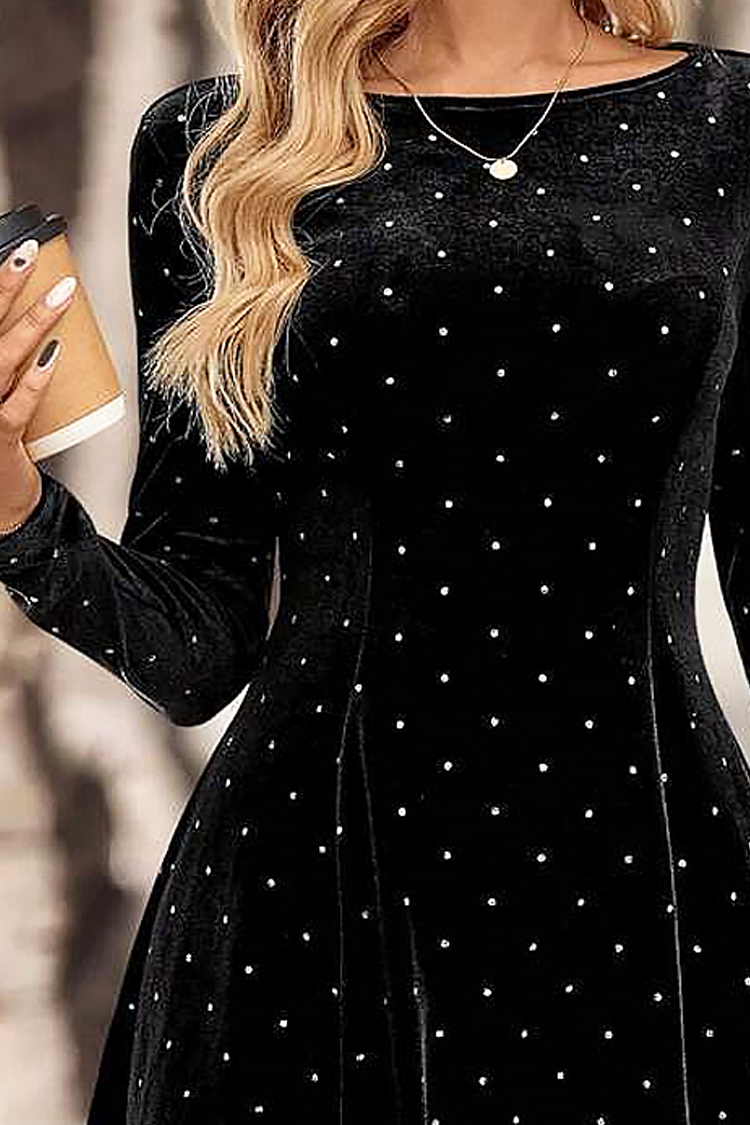 - Haljina ima duge rukave, pripijeni kroj i spektakularan uzorak točkica.