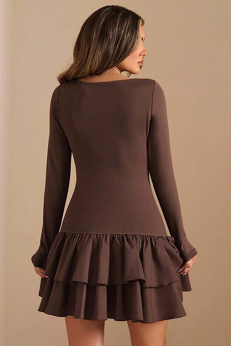 - Haljina ima duge rukave, pripijeni kroj i kratku duljinu.