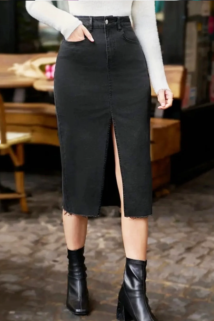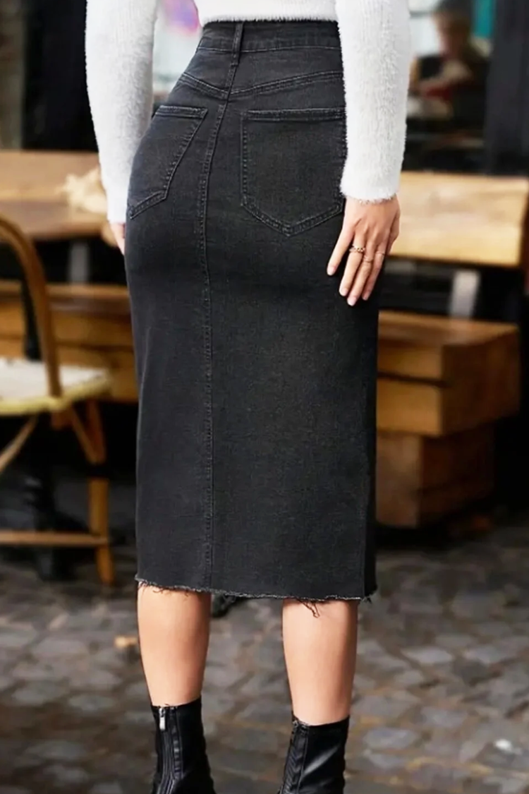 - Za svoj trendi izgled odaberite ovu traper midi suknju, prikladnu za razne modne kombinacije.