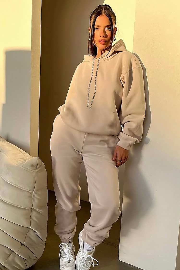 - Majica s kapuljačom ima duge rukave, spektakularne vezice i predimenzionirani kroj, a hlače imaju elastičnu traku i visoki struk.