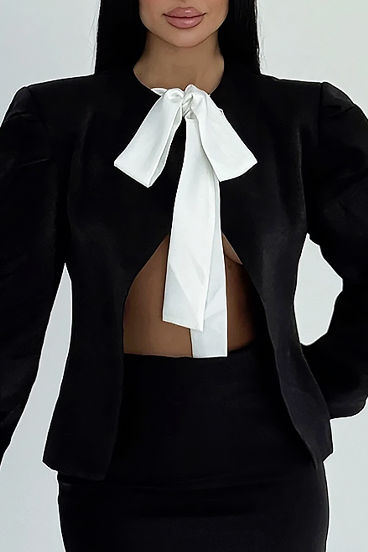 - Bluza ima elegantan dizajn, duge rukave i naglašenu vrpcu sprijeda, a suknja ima pripijeni seksi kroj.