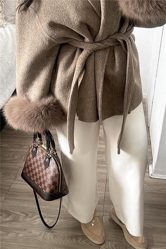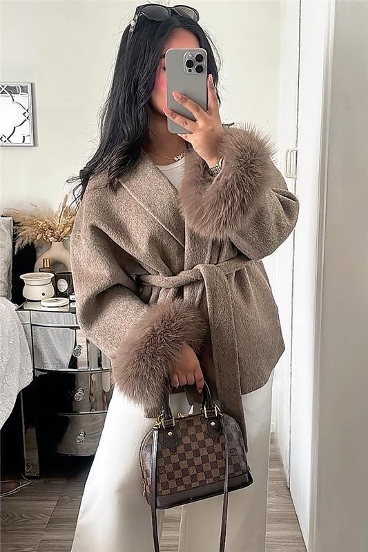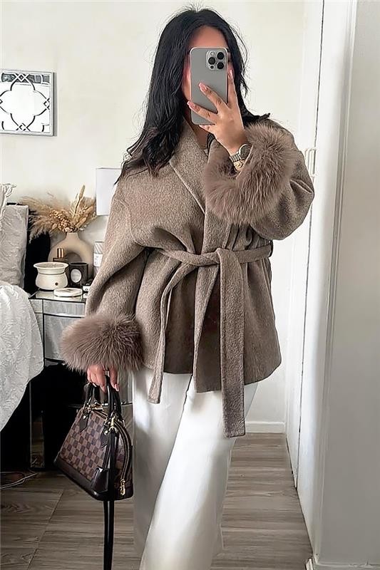 - Model ima udoban kroj, ovratnik, remen od iste tkanine i spektakularne perjane manžete na rukavima.