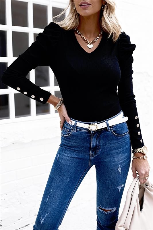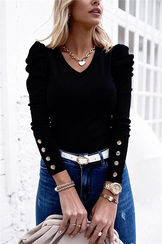 - Bluza ima klasičan i udoban kroj, s koketnim dizajnom s gumbima na rukavima.
