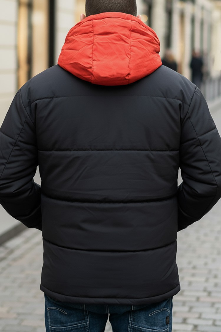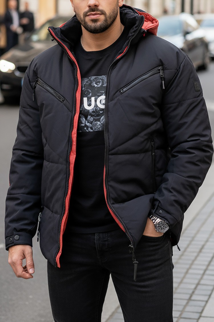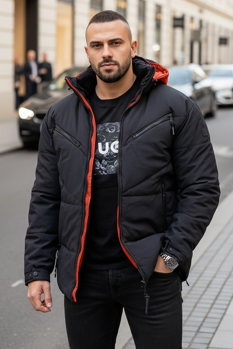 - Elegantna i topla muška zimska jakna u mat crnoj boji, koja kombinira udobnost i moderan urbani dizajn.