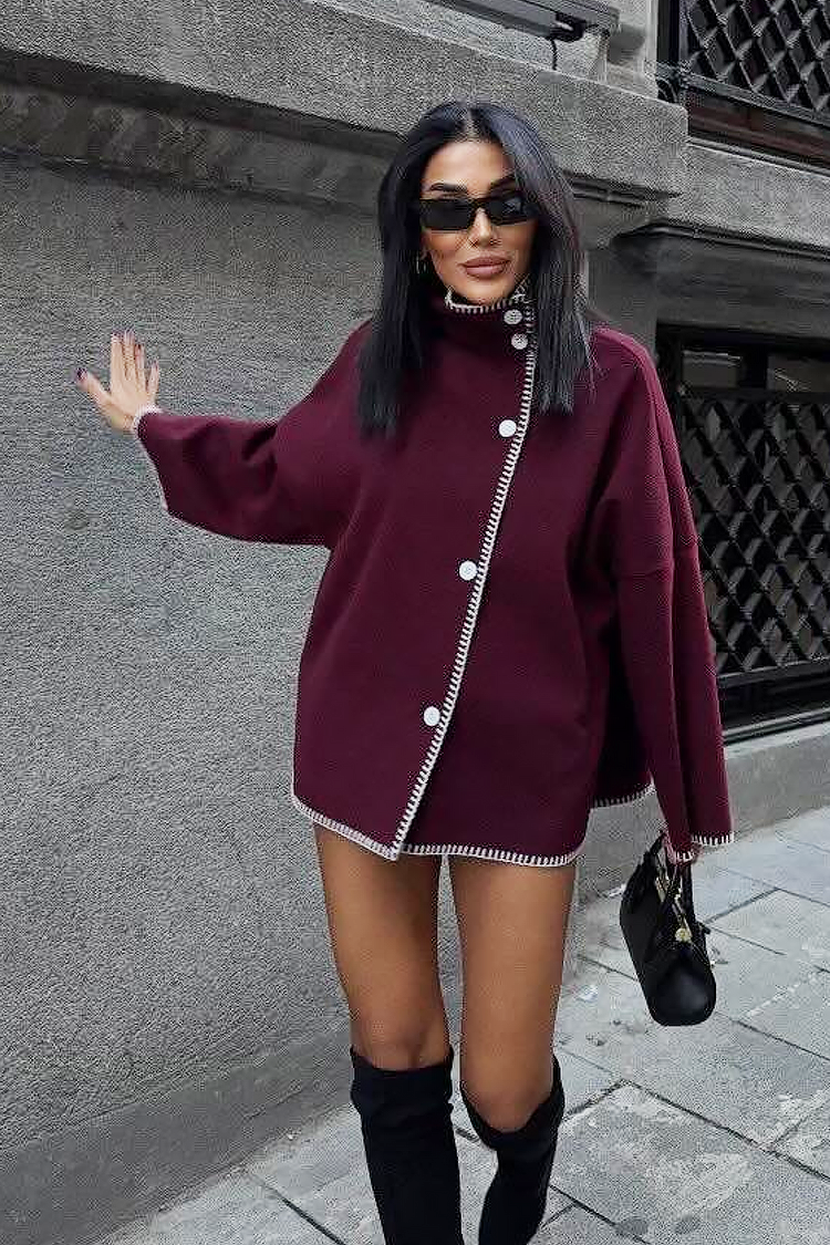 - Model ima moderan predimenzionirani kroj, elegantan ovratnik i gumbe po cijeloj duljini.