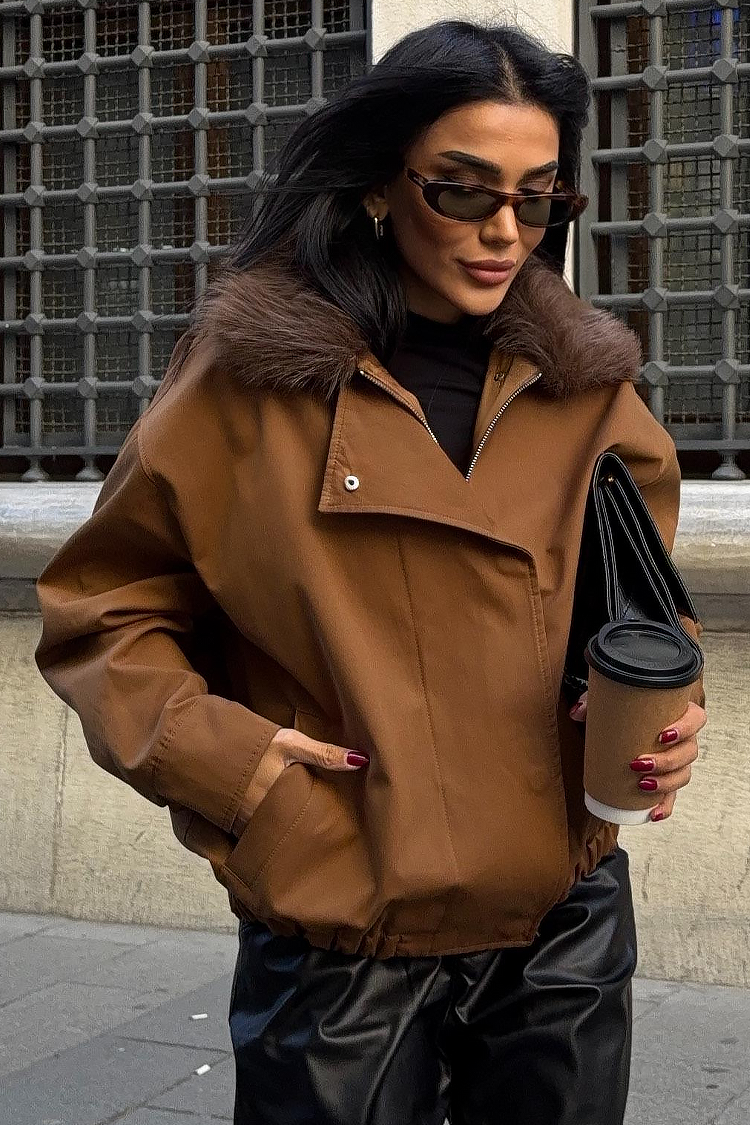 - Model ima pahuljasti ovratnik, bočne džepove te kopčanje patentnim zatvaračem i gumbima sprijeda.