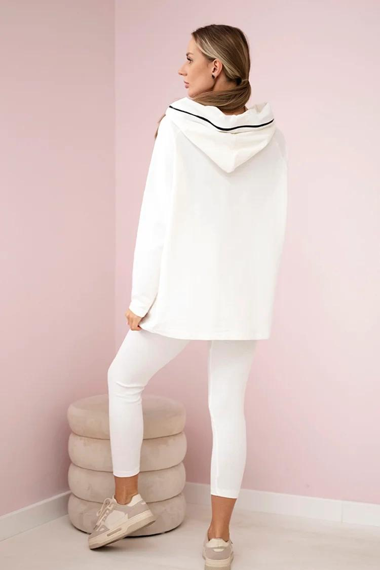 - Majica s kapuljačom ima duge rukave, predimenzionirani kroj i kapuljaču s patentnim zatvaračem, a tajice imaju elastiku i visoki struk.