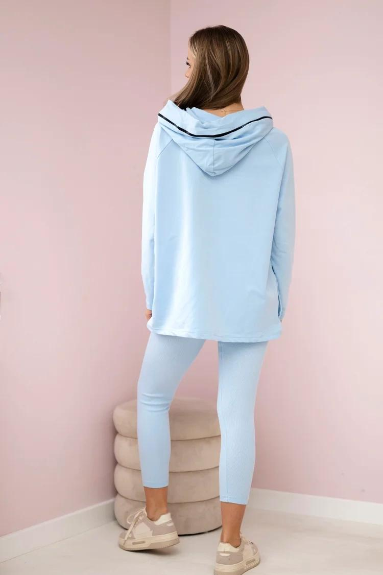 - Majica s kapuljačom ima duge rukave, predimenzionirani kroj i kapuljaču s patentnim zatvaračem, a tajice imaju elastiku i visoki struk.