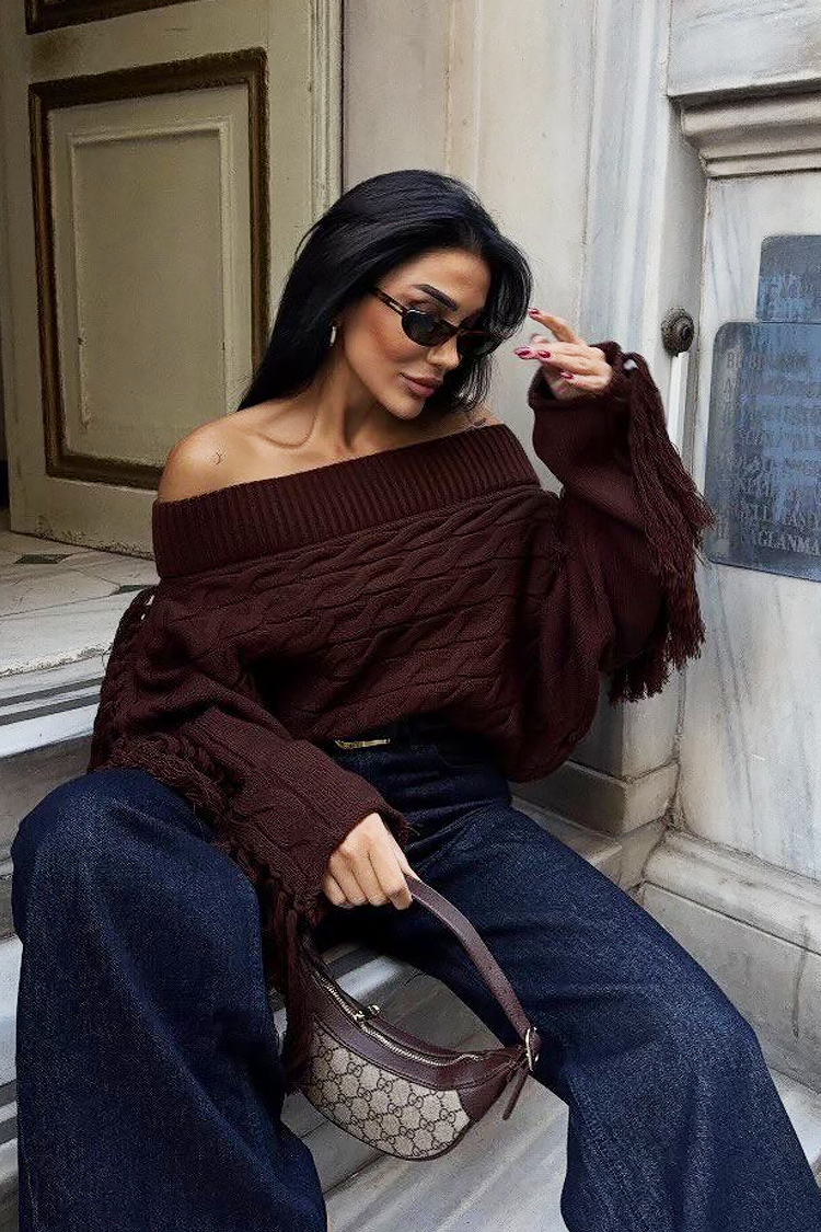 - Moderan ženski džemper u smeđoj boji, prikladan za svakodnevni i trendi izgled.