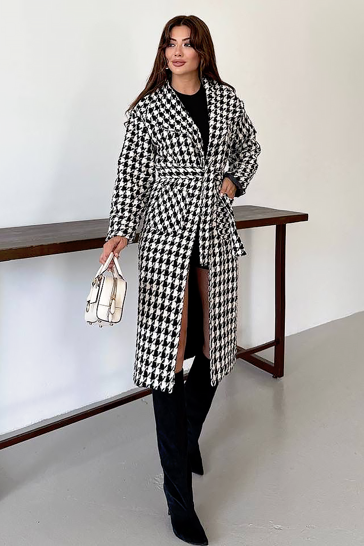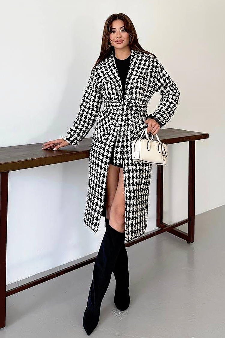- Model ima široki kroj, klasični ovratnik i remen od iste tkanine.