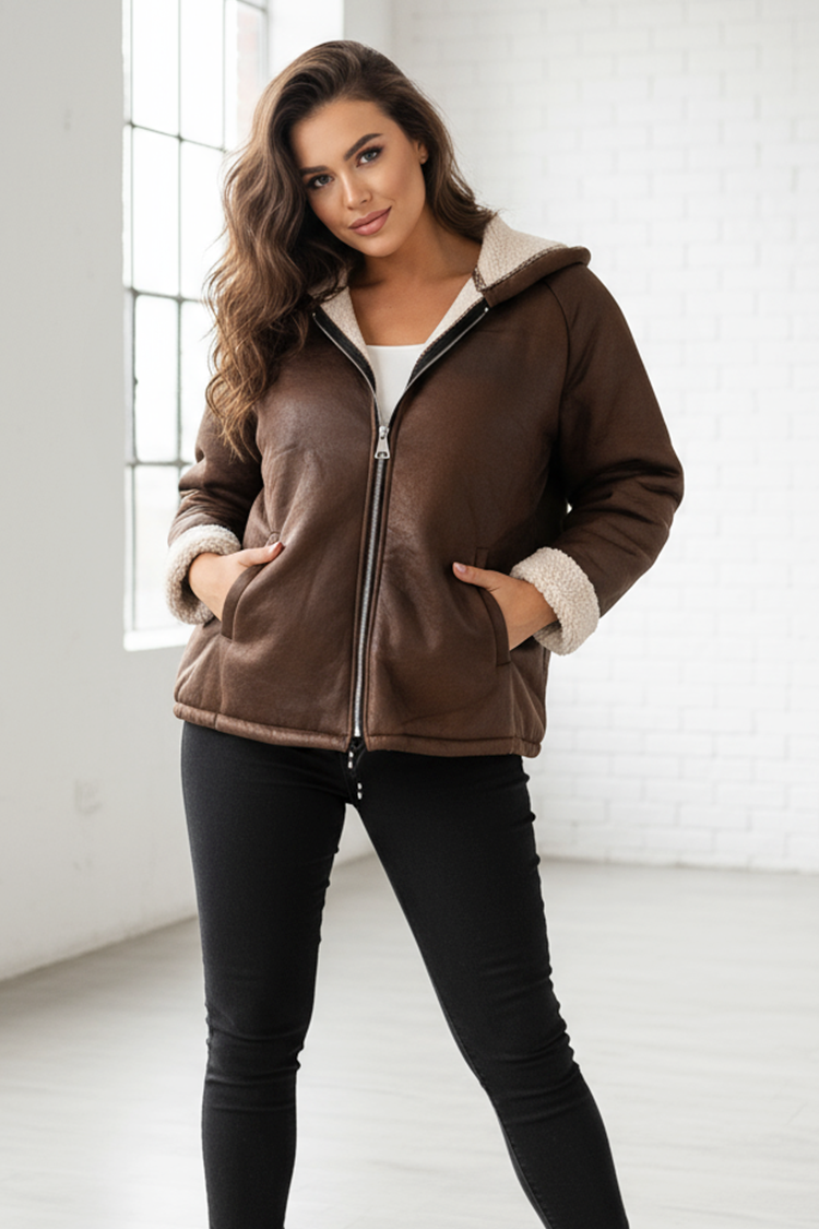 - Model ima pahuljastu kapuljaču, bočne džepove i patentni zatvarač sprijeda.