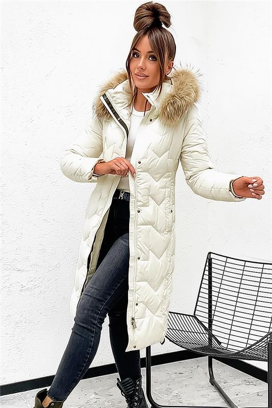 - Model ima udoban kroj, praktične džepove, dvostruko kopčanje patentnim zatvaračem i gumbima te kapuljaču s perjem.