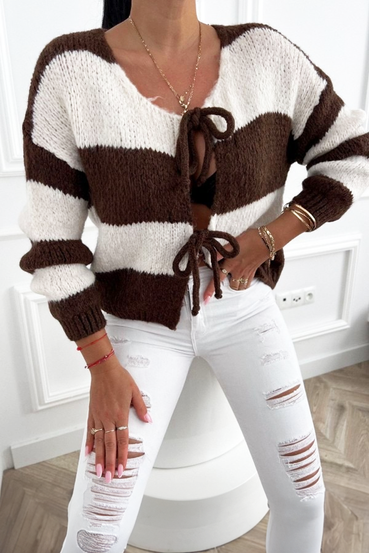 - Ženski kardigan s dvobojnim uzorkom, prikladan za jesenske modne izglede.