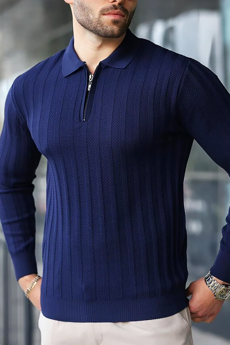 - Udoban i elegantan muški džemper s ovratnikom na patentni zatvarač i jednobojnim uzorkom.