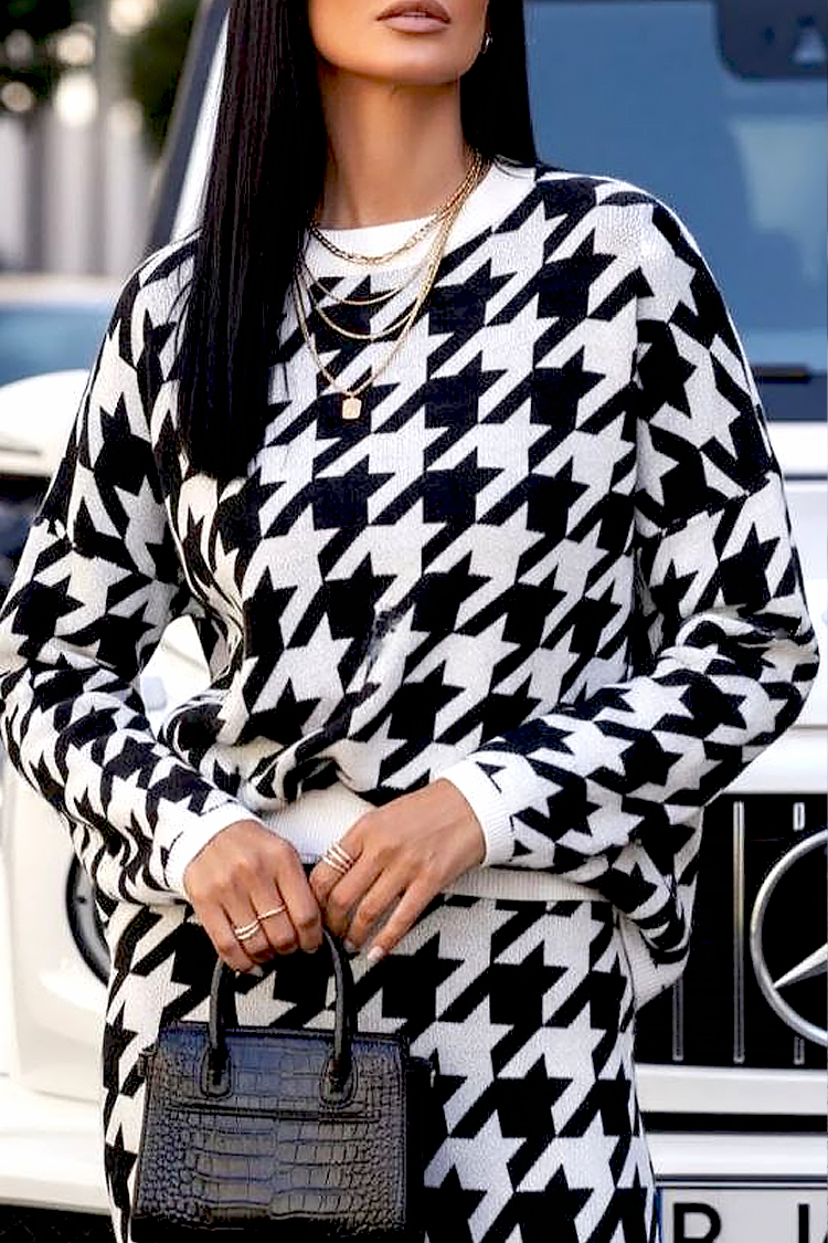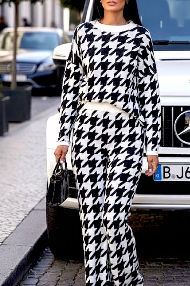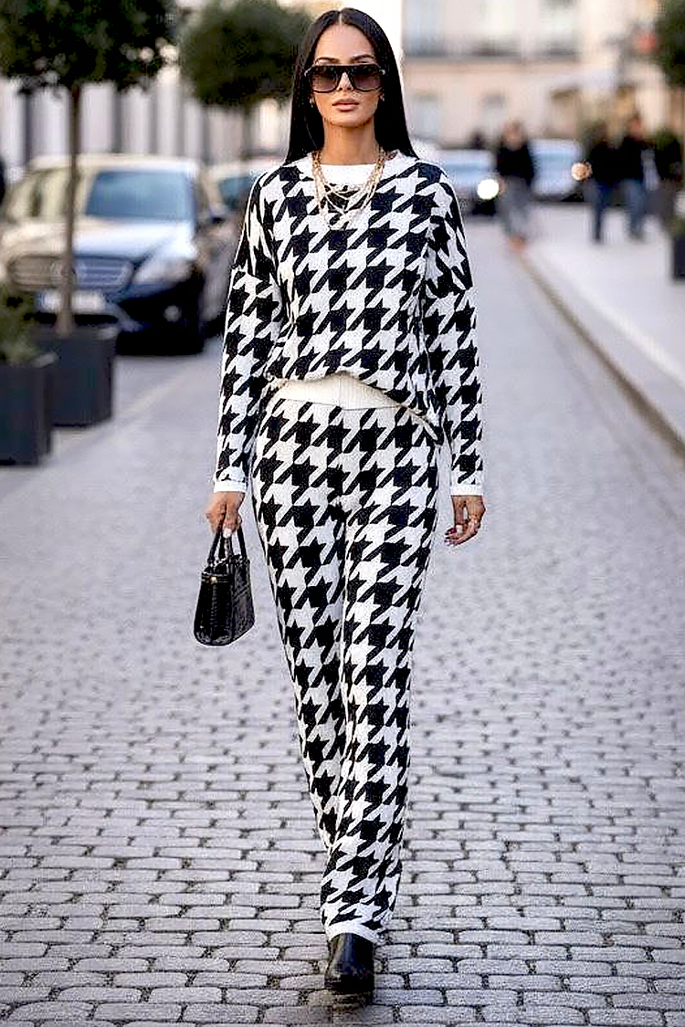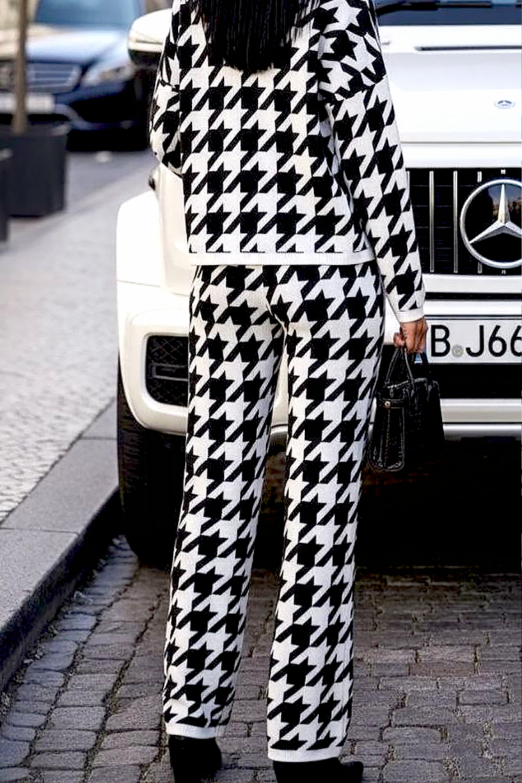 - Bluza ima udoban kroj i dugu duljinu, a hlače imaju visoki struk i široke nogavice.