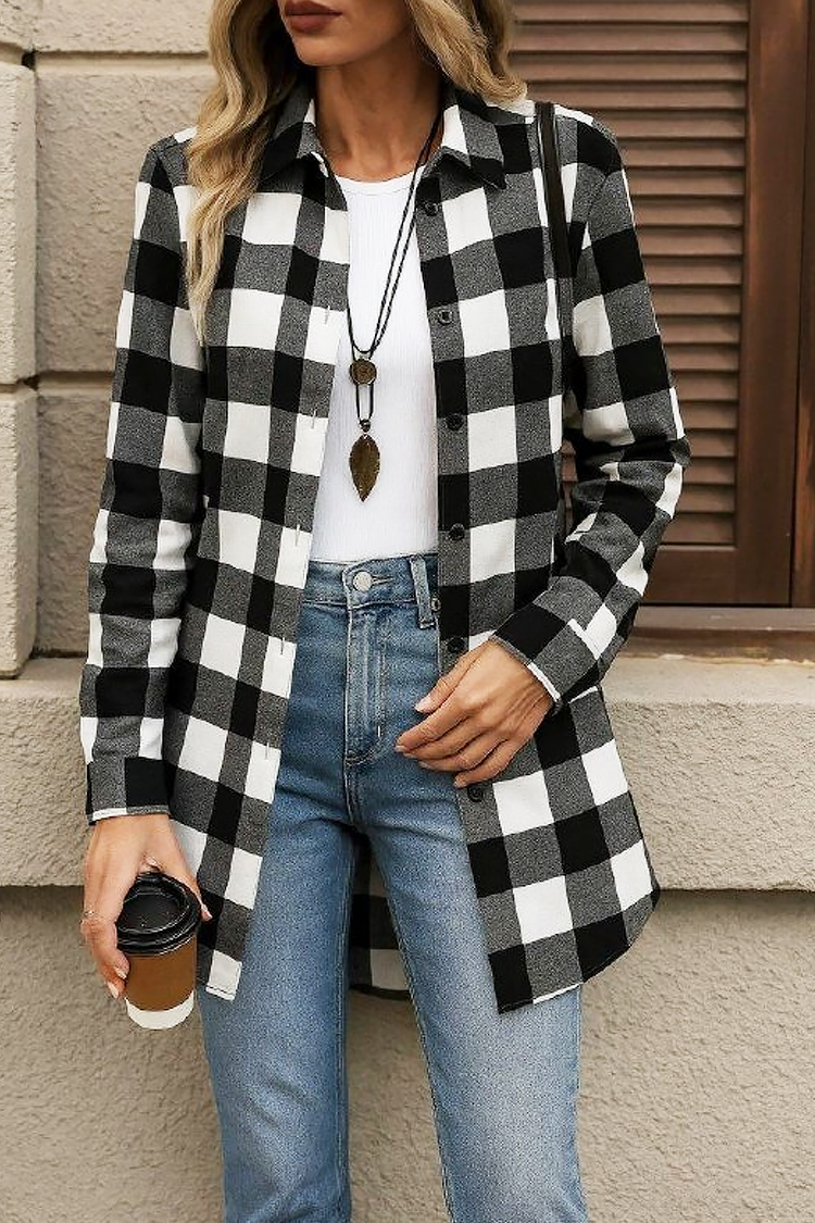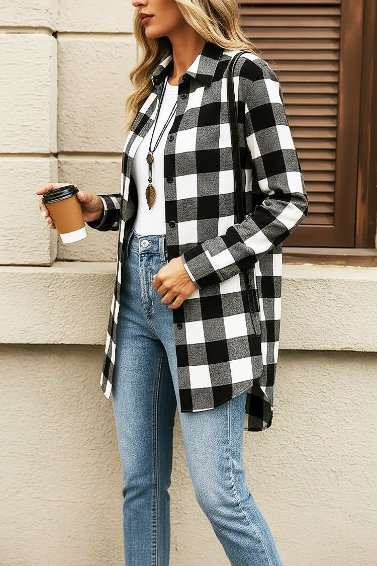 - Model ima asimetrični kroj, karirani dizajn i standardno kopčanje na gumbe.
