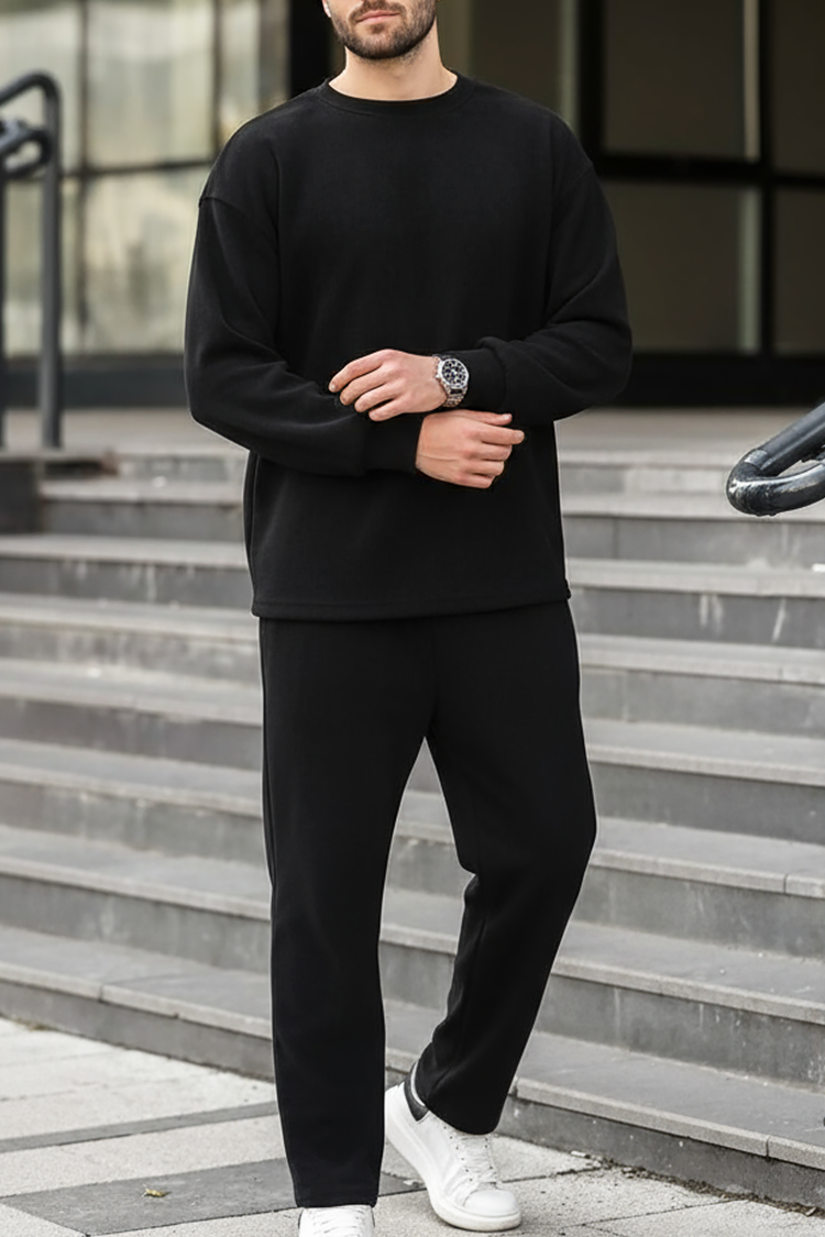 - Udoban muški dvodijelni set koji se sastoji od dukserice s kapuljačom i hlača u crnoj boji.