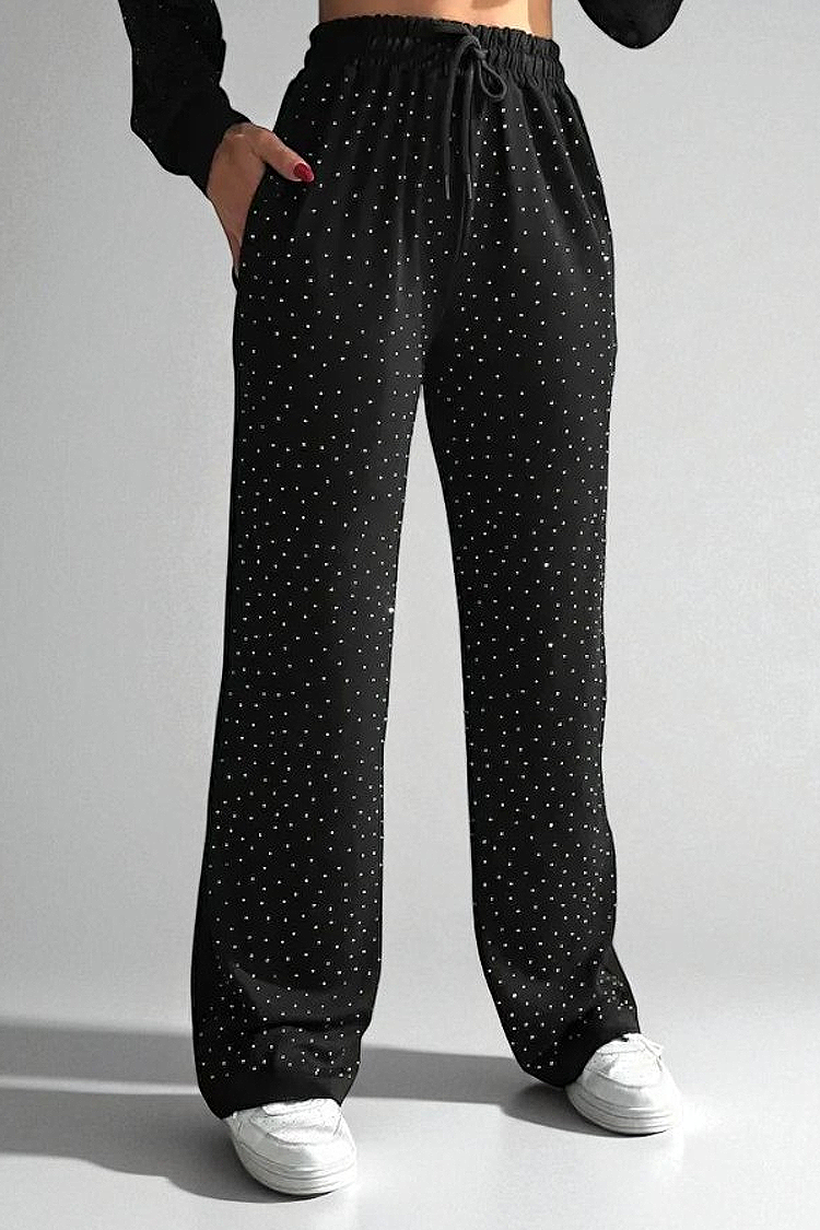 - Model ima elastičan struk, vezice i sjajne elemente.