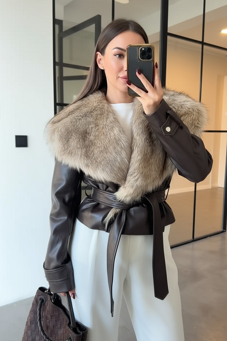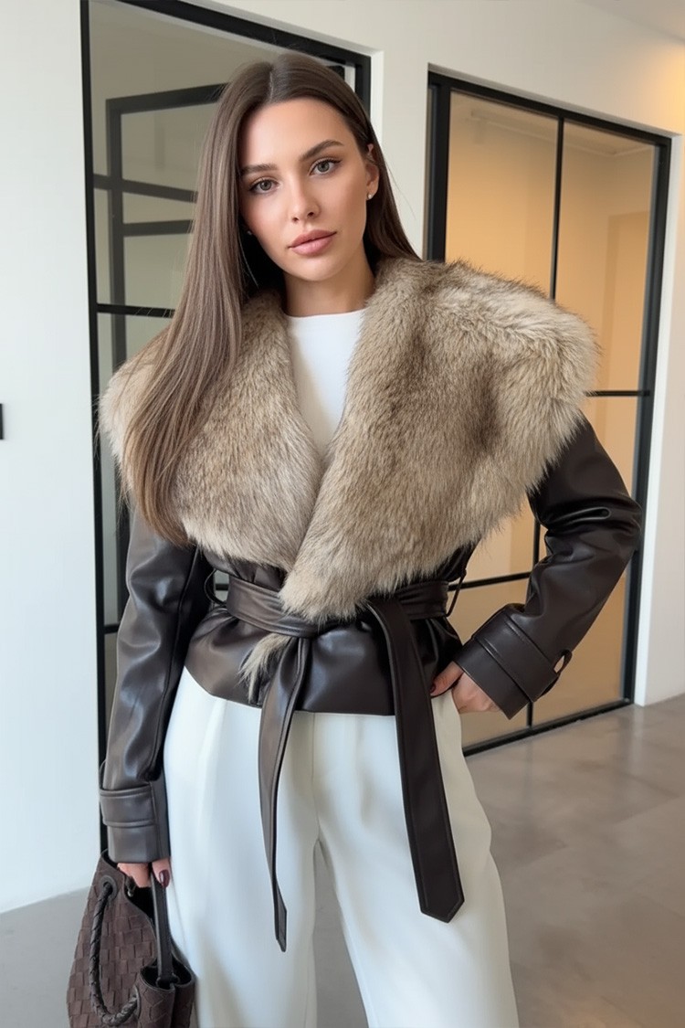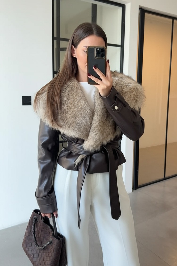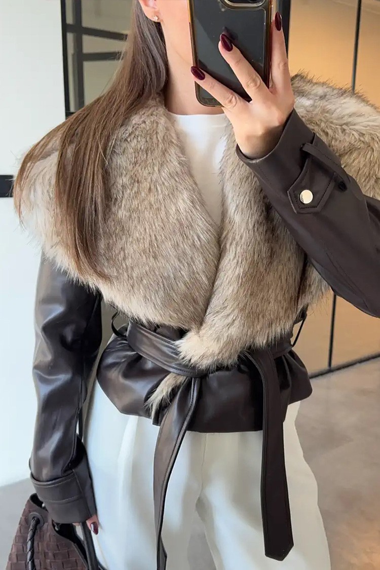 - Model ima udoban kroj, remen od iste tkanine, spektakularan voluminozni ovratnik s perjem i manžetama.