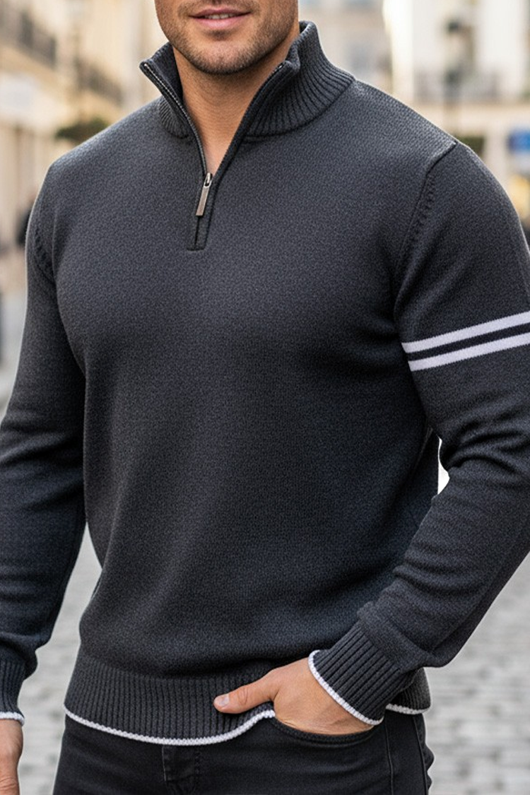 - Moderni muški džemper s polo ovratnikom i patentnim zatvaračem, prikladan kao dodatak svakodnevnoj odjevnoj kombinaciji.
