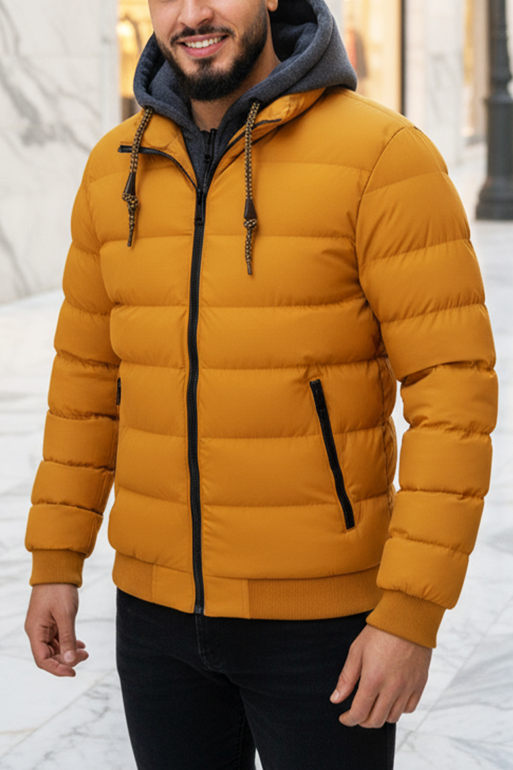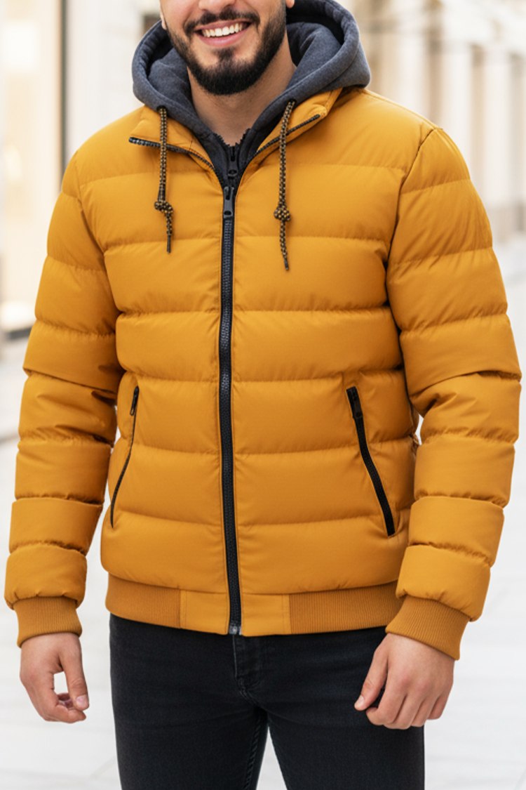 - Moderna prošivena muška jakna u boji senfa, koja kombinira udobnost i moderan urbani dizajn.