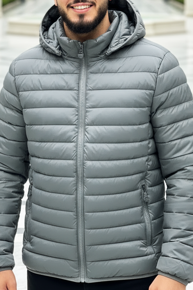 - Udobna muška jakna s horizontalnim prošivenim dizajnom i odvojivom kapuljačom u sivoj boji sa sportsko-svakodnevnim stilom.