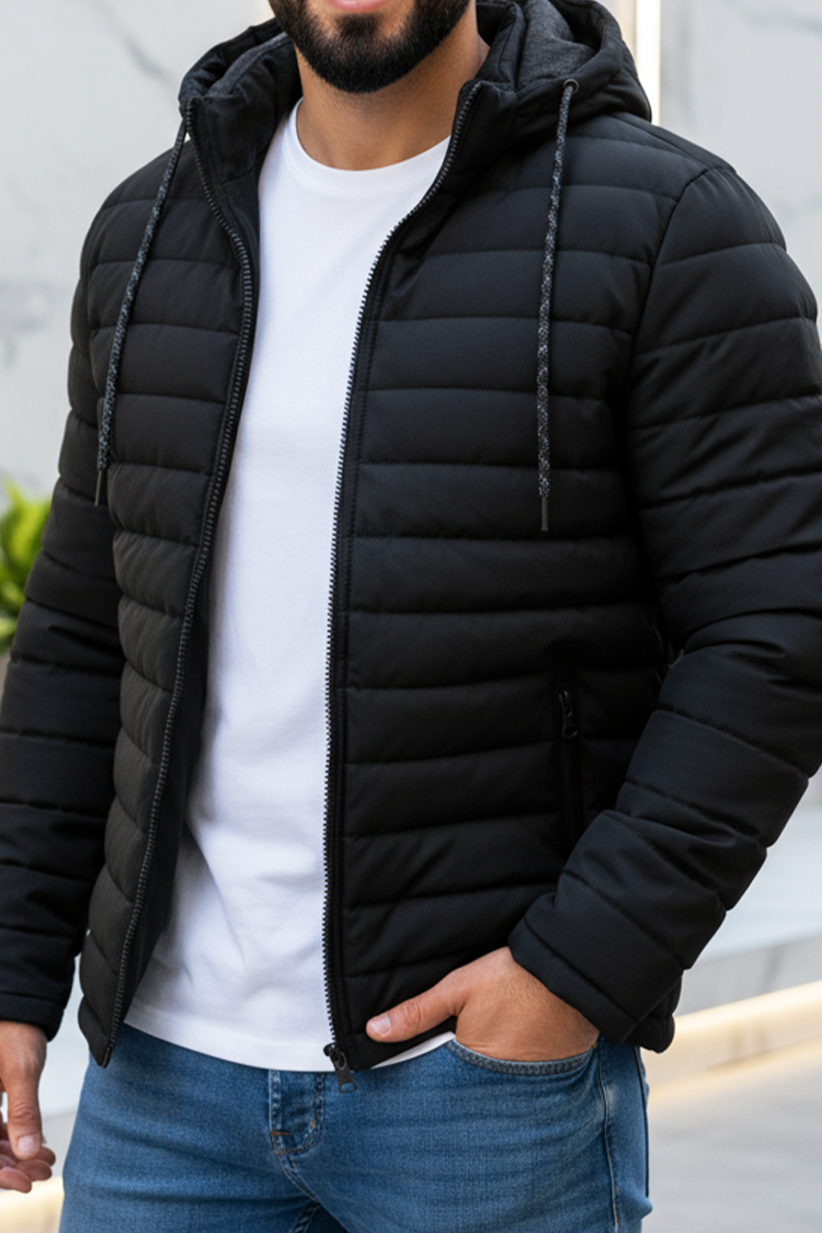 - Predstavljamo vam našu posebnu ponudu: muška zimska jakna u trendi dizajnu u crnoj boji.