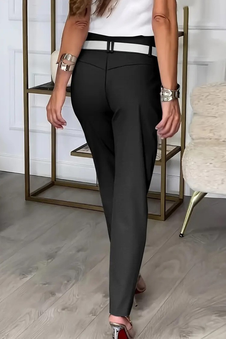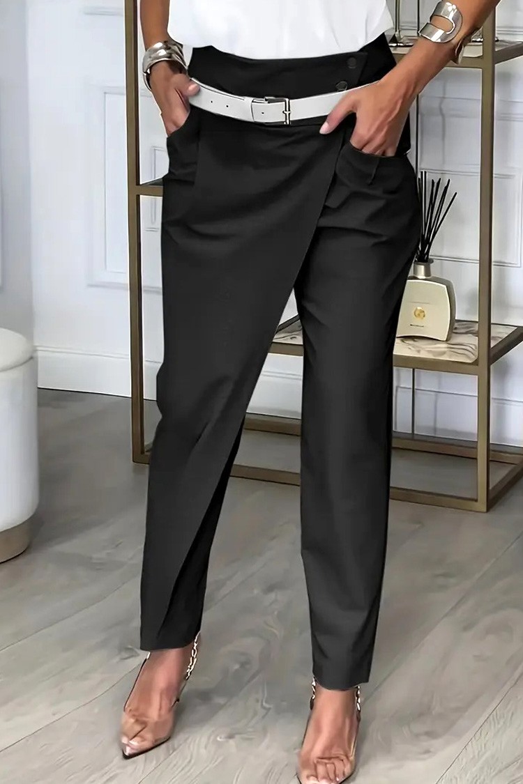 - Ženske hlače s visokim asimetričnim strukom i gumbima, prikladne za svakodnevni život i ured.
