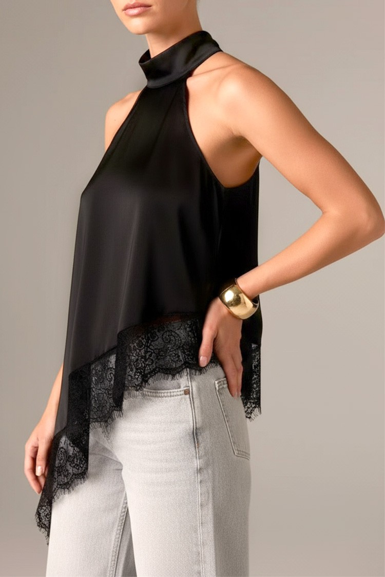 - Model impresionira asimetričnim krojem, visokim ovratnikom i seksi čipkom.