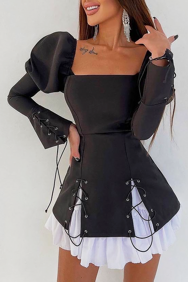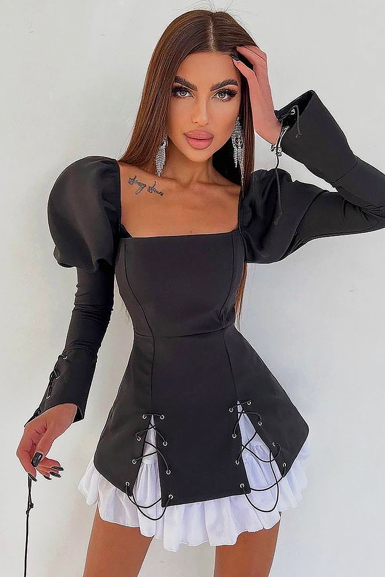 - Haljina ima seksi dizajn, četvrtasti izrez i duge spektakularne rukave.