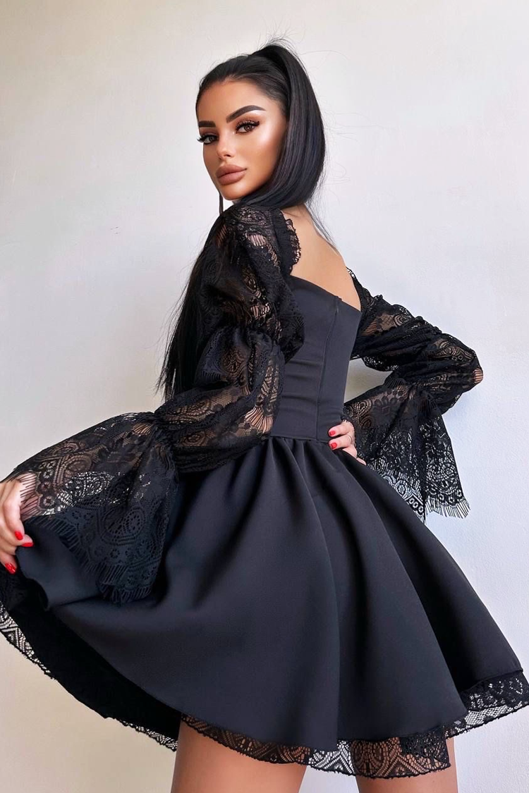- Haljina ima pripijeni kroj, duge rukave s čipkom, spuštena ramena i atraktivan dekolte.