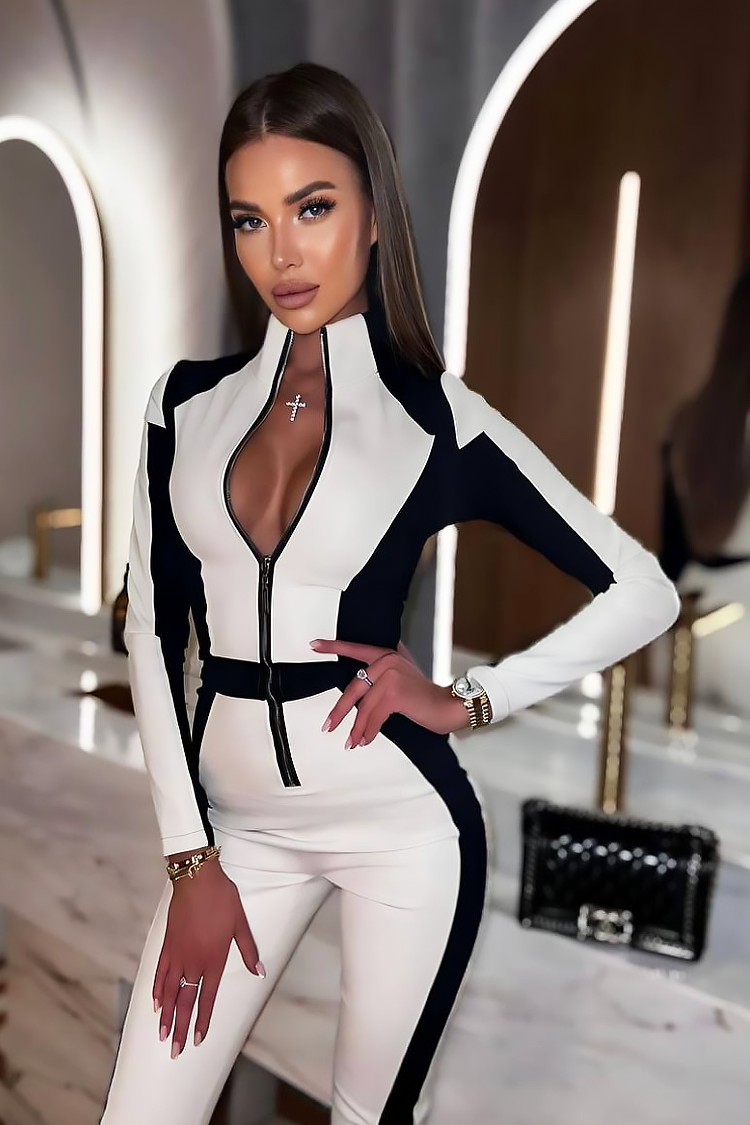 - Moderni ženski kombinezon u klasičnim bojama, pogodan za svečane izglede i svakodnevni život.