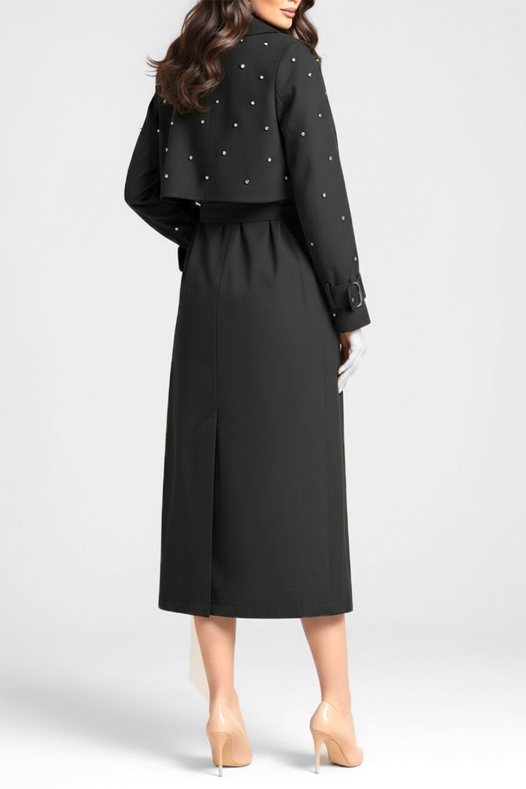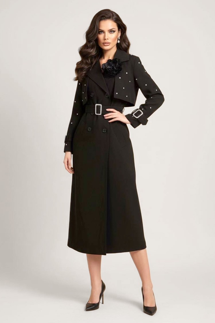 - Model ima klasičan kroj, remen i manžete s kopčom, ukrasne bisere i naglašenu ružu na ovratniku.
